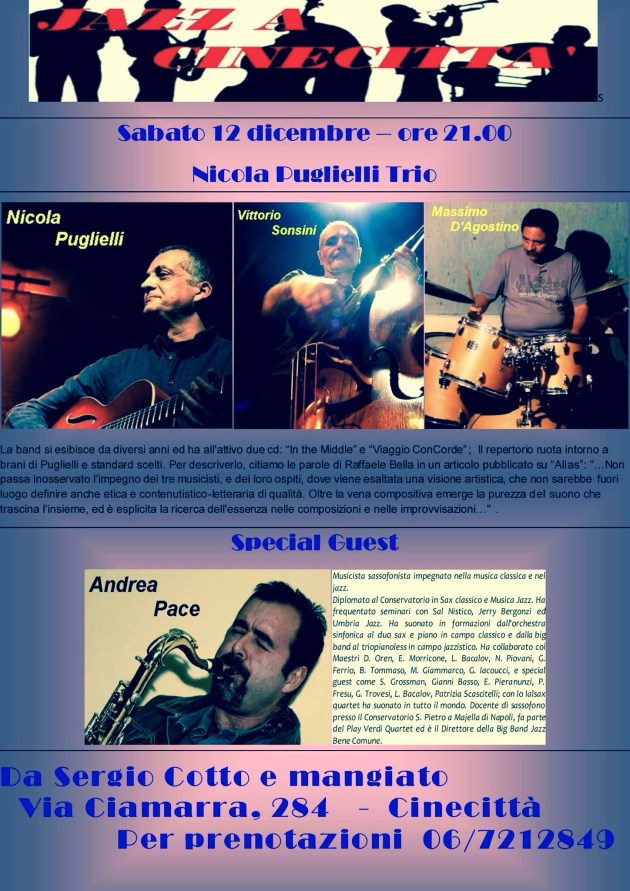 Puglielli Trio plus A.Pace. Jazz a Cinecittá. 12.12.15 Posted on dicembre 11, 2015 by npuglielli Condividi: Fai clic per condividere su X (Si apre in una nuova finestra) X Fai clic per condividere su Facebook (Si apre in una nuova finestra) Facebook Mi piace Caricamento... Correlati