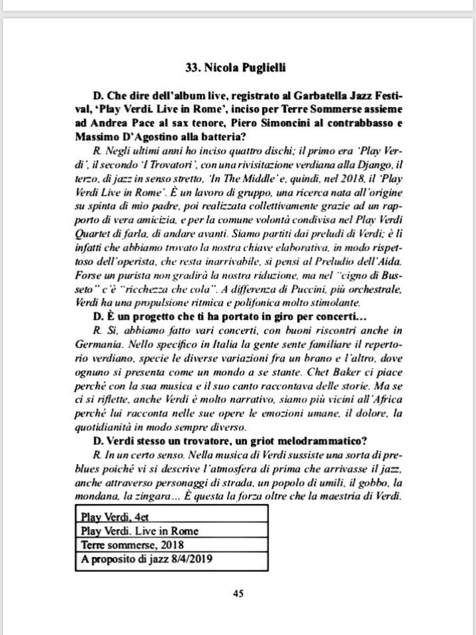 Nicola Puglielli è nato a Roma nel 1962. Chitarrista e compositore, sempre alla ricerca di nuove frontiere chitarristiche e jazzistiche. Un importante risultato di queste ricerche è l’album “Play Verdi“ del 2015 (anche in versione “Play Verdi Live“, Terre Sommerse), un sensibile avvicinamento di quattro jazzisti all’opera verdiana, con uno sguardo di ammirazione verso “Play Bach“, storico esperimento jazz meets classic di Jean-Jacques Loussier.