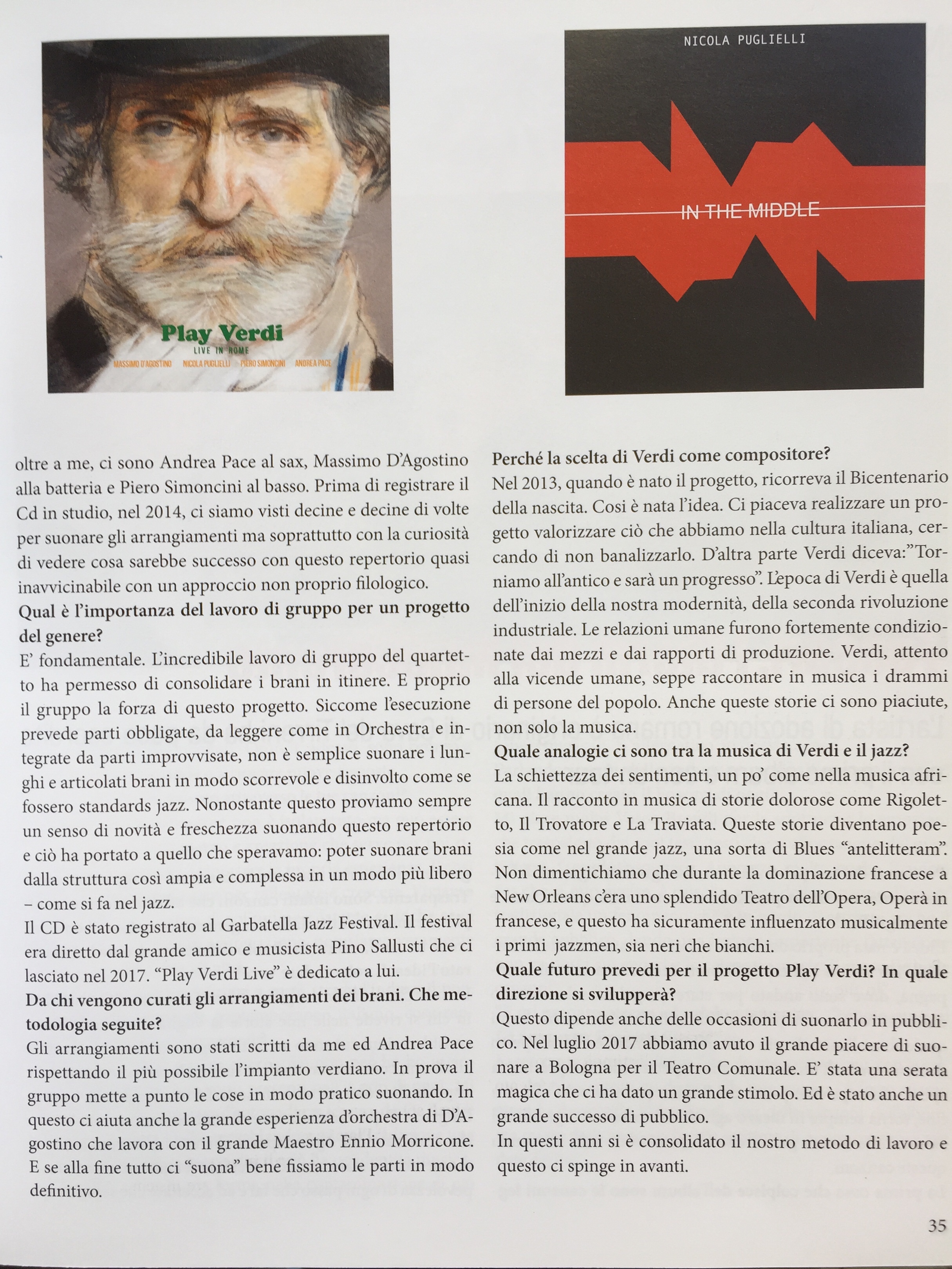 Sul CD mette insieme proprie composizioni (come Non scordar la memoria, dedicato al sassofonista e amico Massimo Urbani e In the Middle dall’onomino album), ballate (The Ballad of the Fallen, brano per uno studente ucciso in Salvador che da il titolo ad un disco della Liberation Music Orchestra di Charlie Haden e Carla Bley), ritmi di strumenti africani (come il Berimbau che accompagna la Capoeira brasiliana: una sintesi di lotta contro i schiavisti, acrobazia e musica), la messa in musica di un nome composto da note (Mi-c-h-a-e-la) e la versione jazz di un’aria di un’opera di Giuseppe Verdi (Stride la vampa). Questo brano è estratto dall’album “I Trovatori“ (anche questo prodotto da Terre Sommerse), un raffinato esperimento di elaborazione dell’opera di Verdi in versione gypsy jazz, eseguita in quintetto.